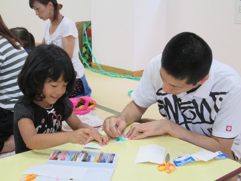 牛乳パックでかえるを作ります。ぱぱのかえるさん、上手だね。