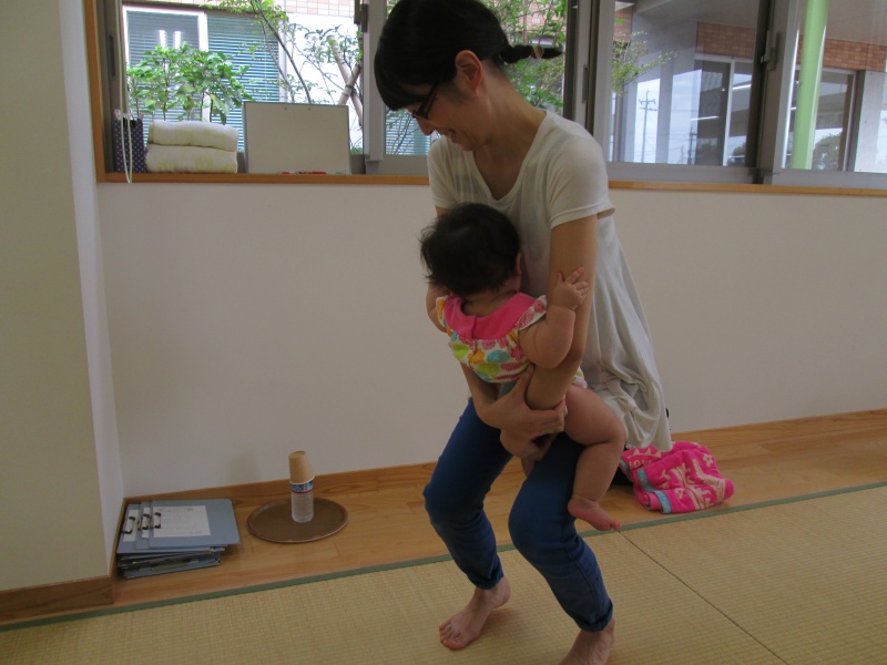 赤ちゃんを抱っこしたまま、足を曲げて、そのままキープ。