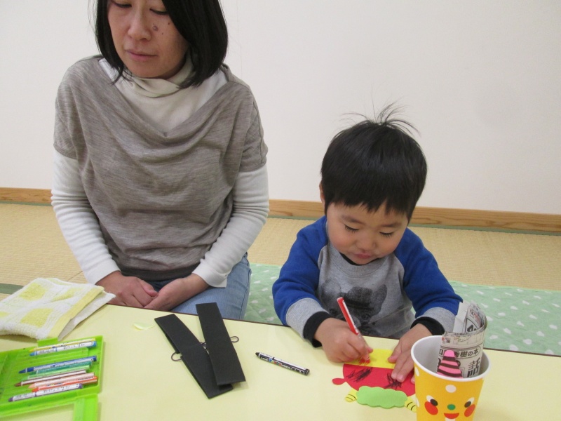 おにのおめん作り。 クレヨンで描き描き、