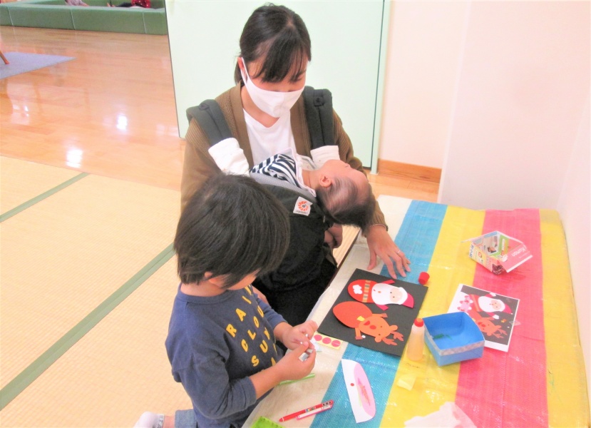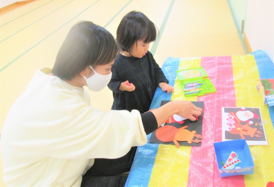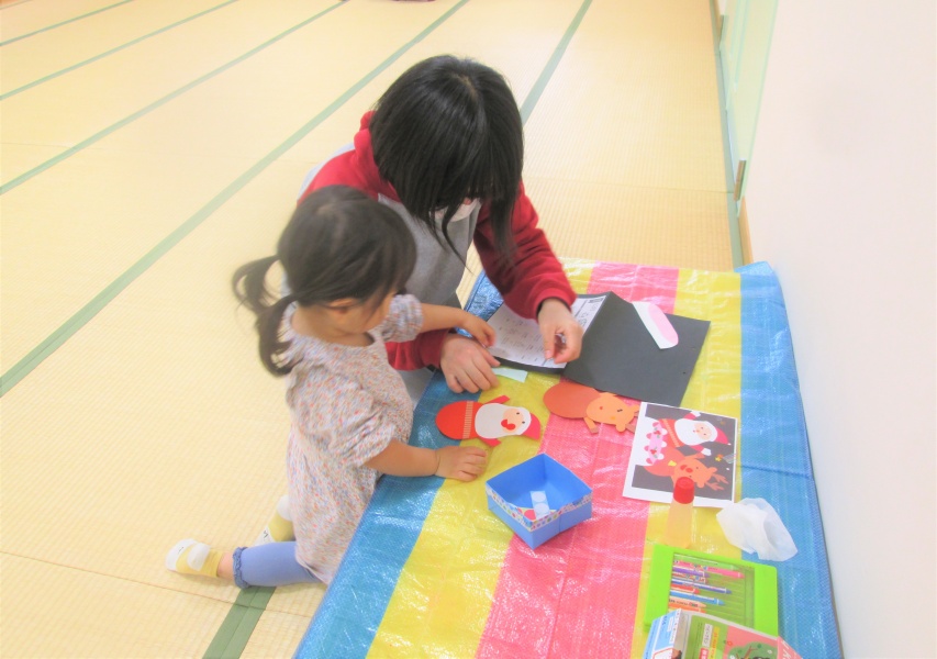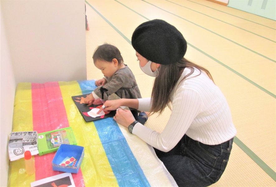 お母さんと一緒に、のりで画用紙をくっつけたり、シールでペタペタ貼ったり・・・