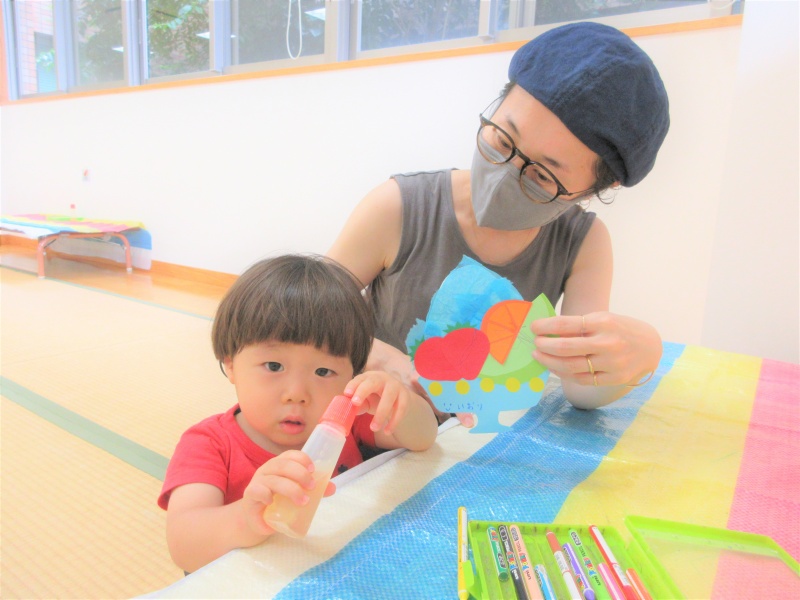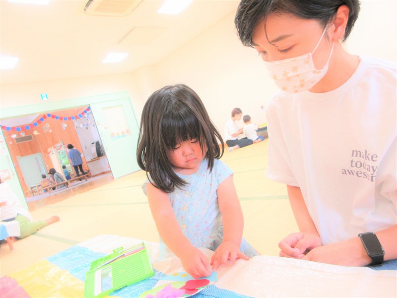 たにっこりんでは、7月2日(金)にかき氷の壁面製作をしました。