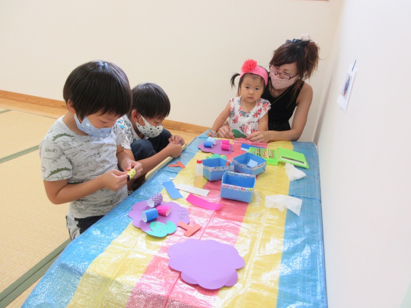 「こうやってのりペッタンするんだー」 お兄ちゃんたちがつくるのを観察中です!