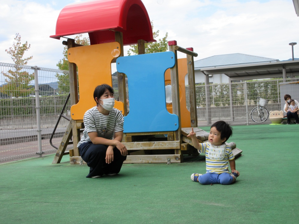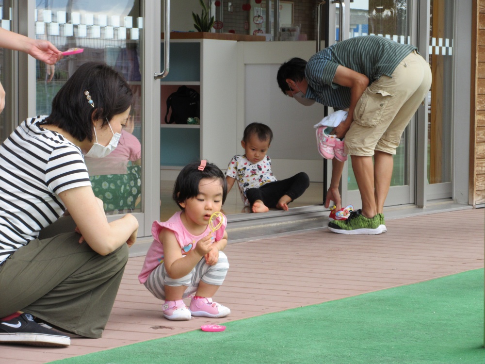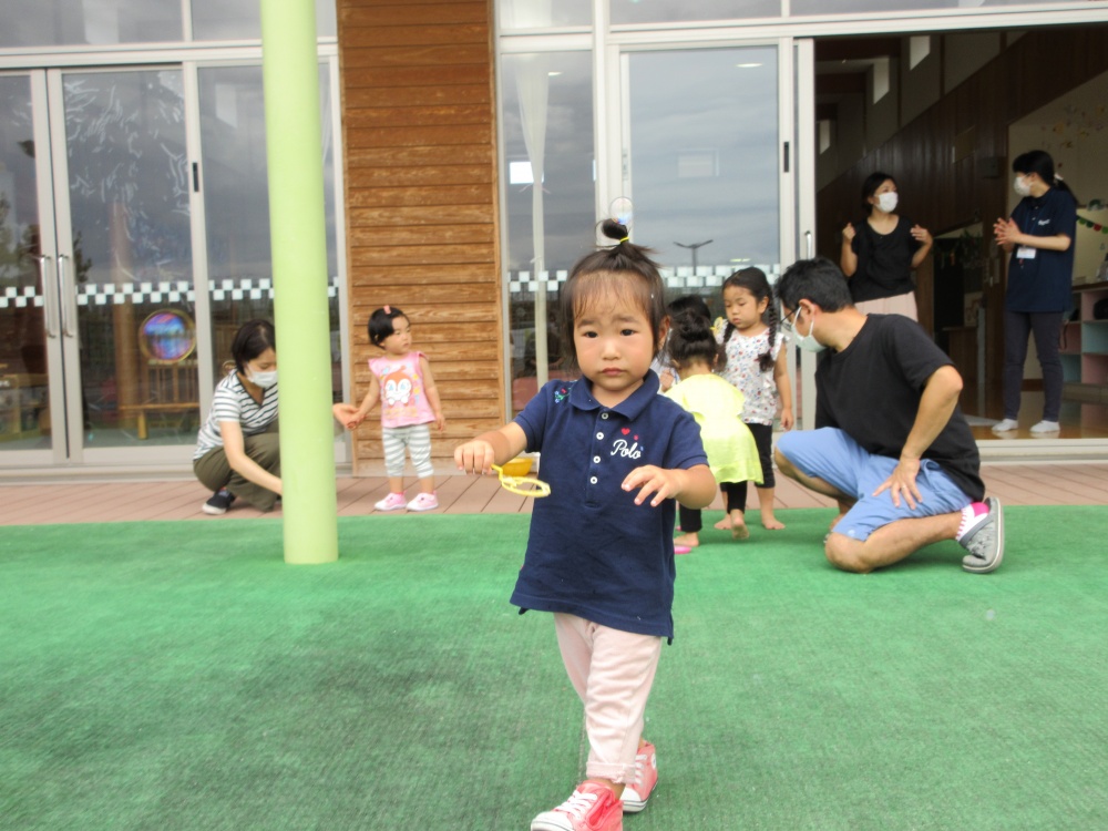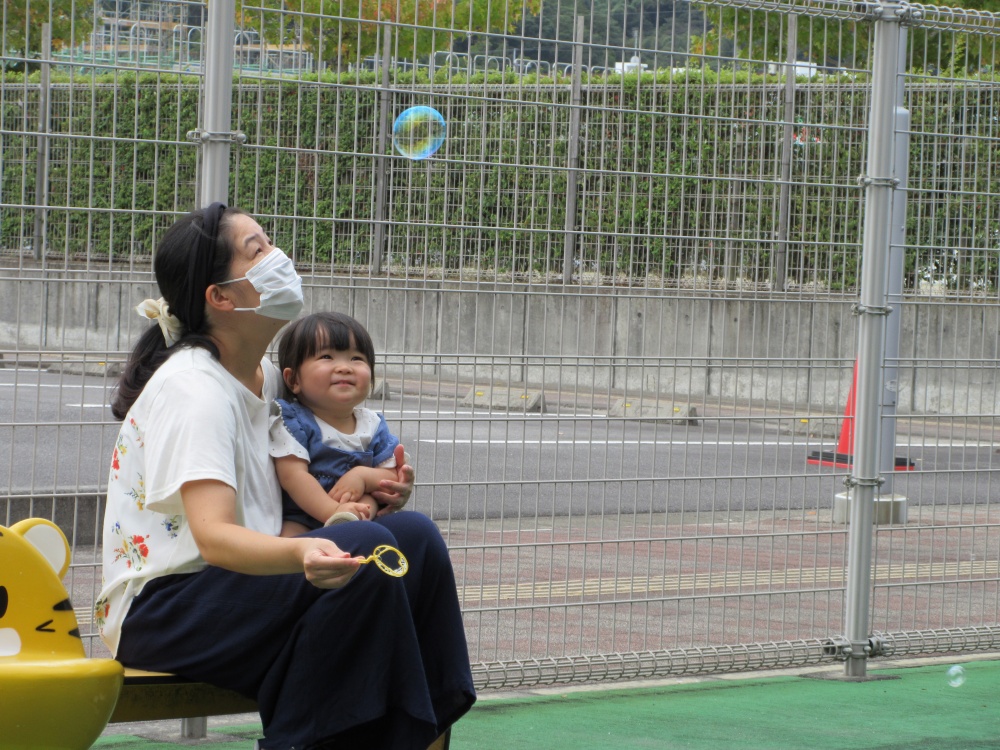 小さなお友だちは、ふわふわ浮くしゃぼん玉を目で追いながら