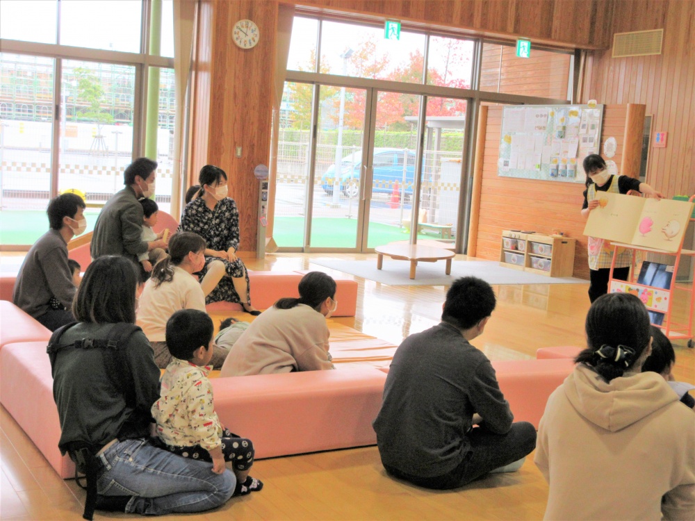 その次は「おしくらまんじゅう」の大型絵本!親子で体を揺らしながら絵本を見た後は、