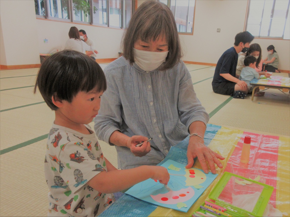 傘の模様は丸シールを貼ったり、お絵描きしたり、自分だけのオリジナルの傘を作っていました!カエルの表情もニコニコ笑顔でかわいいでしたよ♪