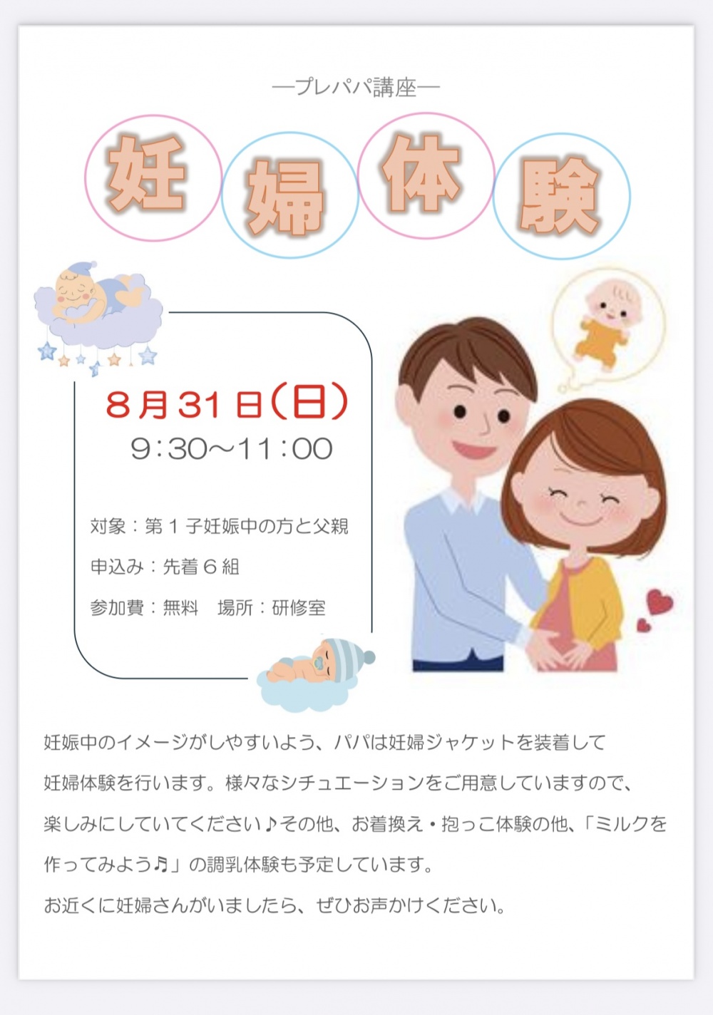 8/31(日)プレパパ講座の募集は、人数に達しましたので、